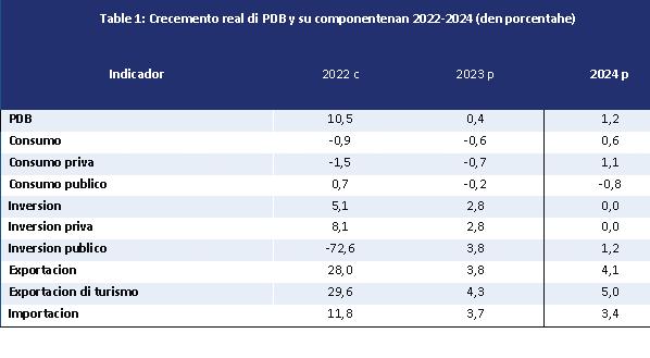 Pa 2023, turismo lo sigui ta e contribuyente principal na crecemento den e producto domestico bruto (PDB), cu e expectativa cu e cantidad di bishitantenan procedente di exterior lo yega 105,0 porciento di e nivel di 2019. Consecuentemente, e balansa di pago (BdP) probablemente lo registra un cantidad significante di entrada atribui na turismo. Na 2023, inversion ta premira di contribui positivamente na e PDB,