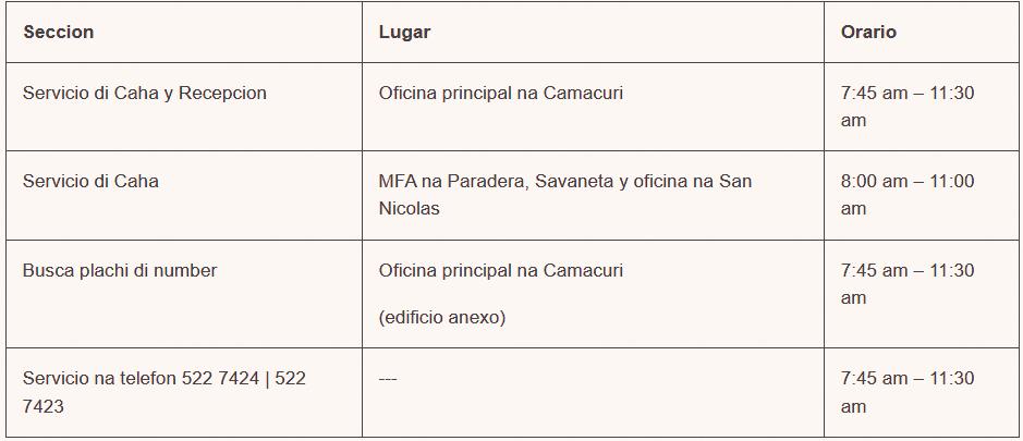 Dialuna, dia 9 di december 2024, Departamento di Impuesto lo continua cu e servicionan manera custumber. Departamento di Impuesto ta pidi tur contribuyente pa tuma nota di e anuncio aki pa evita cualkier inconveniencia.