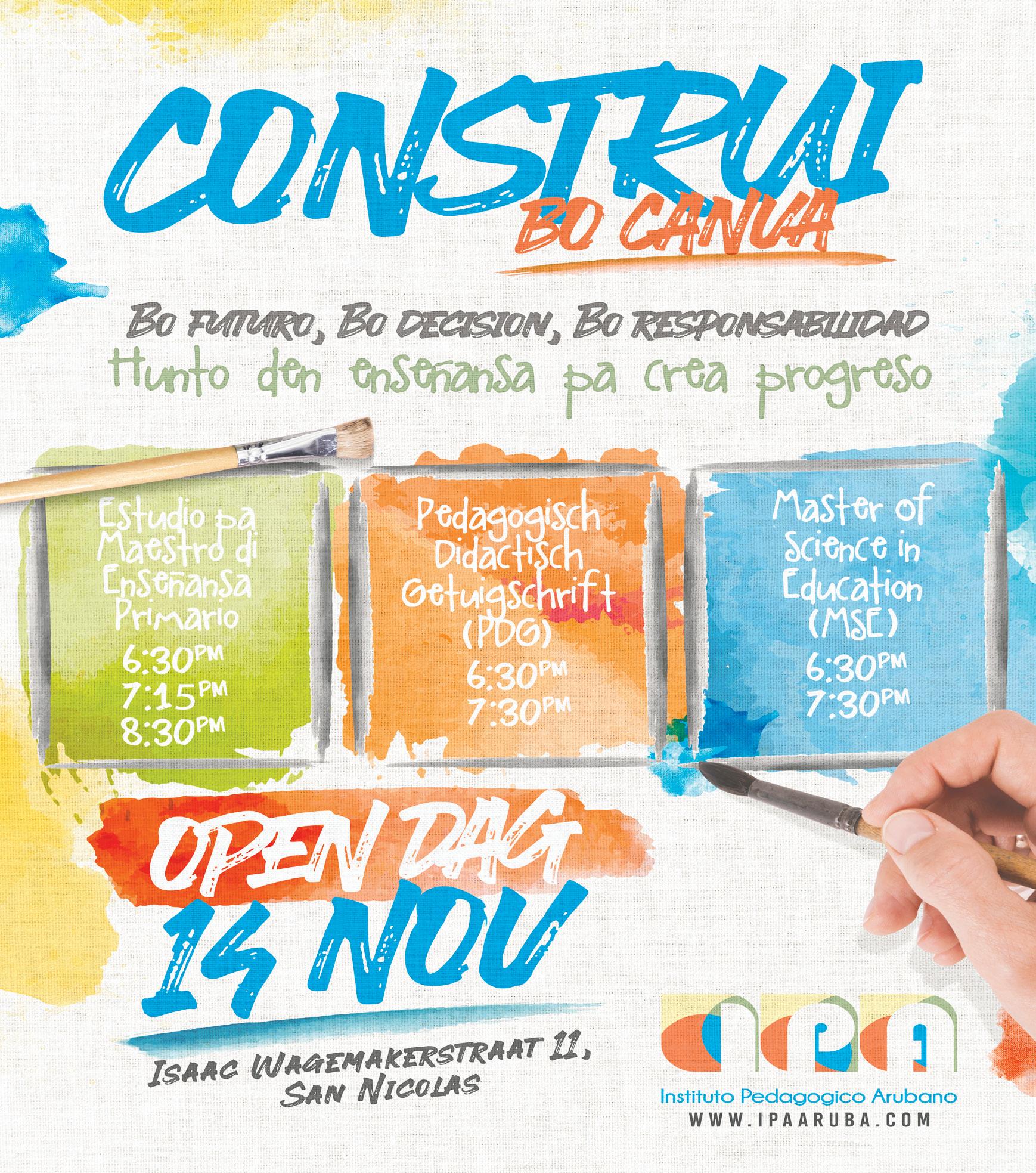 Dialuna, dia 14 di november 2022, IPA ta tene su Dia Publico (Open dag). Durante e actividad nos lo duna informacion di e 3 estudionan cu IPA lo ofrece durante aña academico 2022-2023, cual ta e Estudio pa Maestro di Enseñansa Primario, Curso di Certificacion Pedagogico Didactico (PDG) y Master of Science in Education (MSE): Curriculum & Instruction - Instructional Leadership - Format Community of Learning. Cada estudio tin su grupo meta y orario specifico pa por haya informacion. E Dia Publico ta tuma luga na IPA (Isaac Wagemakerstraat 11, San Nicolas).