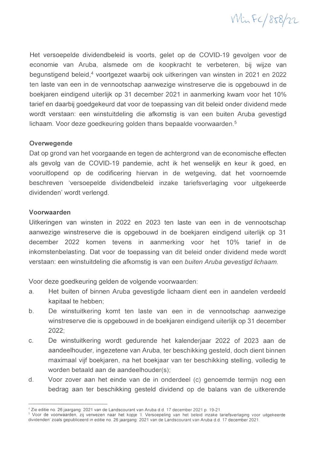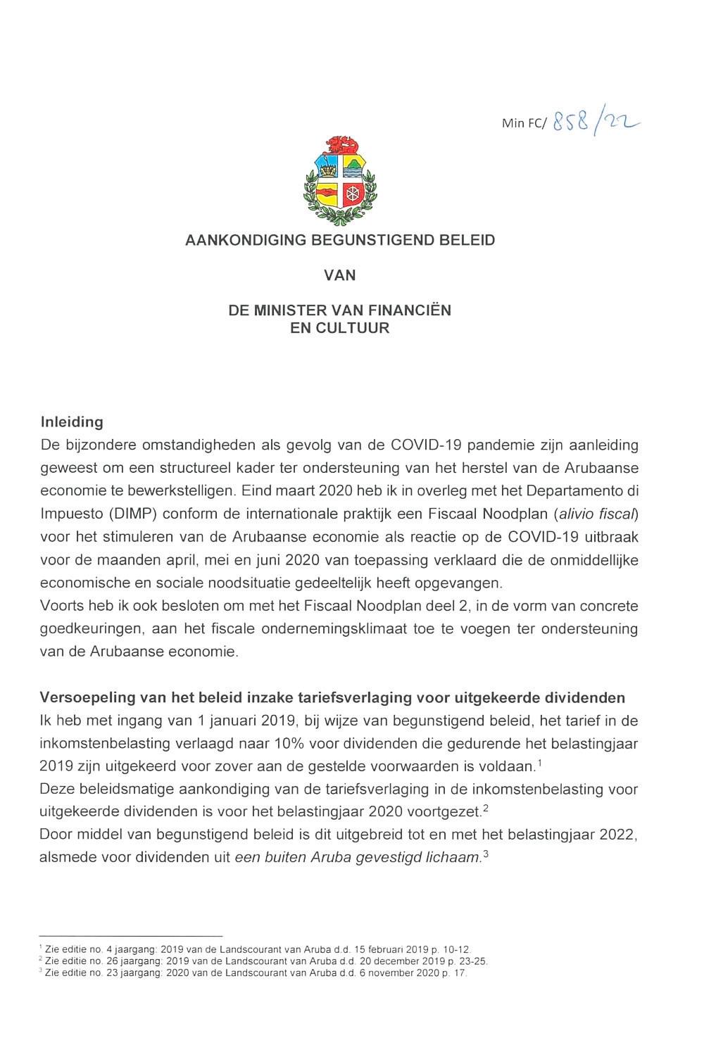 Dia 7 di november Minister di Finansa por medio di un Decreto Ministerial a extende e maneho beneficioso pa pago di impuesto riba dividendo na 10% pa aña 2023.