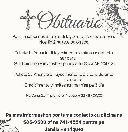 Ta invita pa e acto di entiero cu lo tuma lugar diasabra 16 di September 2023 na misa Inmaculada Concepcion di 2:00 pa 4:00 pm, despues saliendo pa Santana catolico na Sta. Cruz.