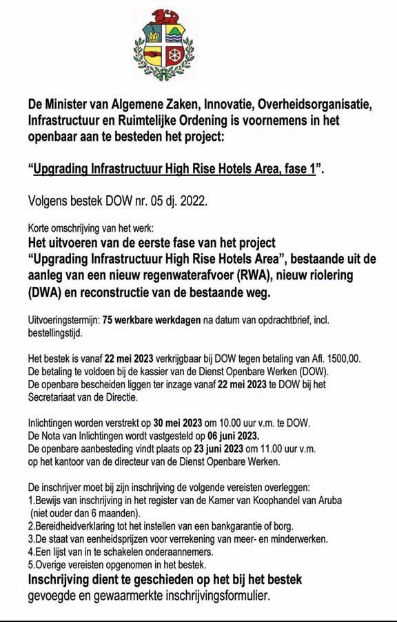 Entrante dialuna 22/5/2023 te cu 26/5/2023 di 7’or di anochi pa 7’or di mainta lo inicia trabounan di renobacion di asfalt for di e salida di Rotonde Kibaima direccion Oranjestad.