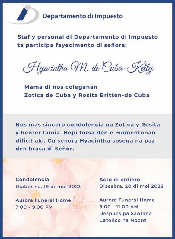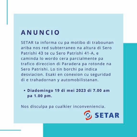 Pagina 28 Diabierna 19 Mei 2023 Brandweer 911 Polis 100 Polis Oranjestad 102 Polis San Nicolas 104 Polis Santa Cruz 105 Polis Shaba 107 Tiplijn 11141 Ambulance San Nicolas 584-5050 Ambulance Sasaki