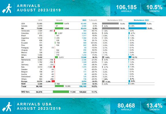 portahe tambe ta e recuperacion di nos mercado mas importante cu ta Estados Unidos cu a registra un cresemento di 13.4% porciento compara cu augustus di aña 2019. Turismo ta sigui crece y sigui surpasa nivelnan di aña 2019 cual sigur ta excepcional.