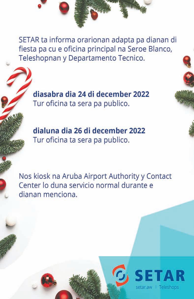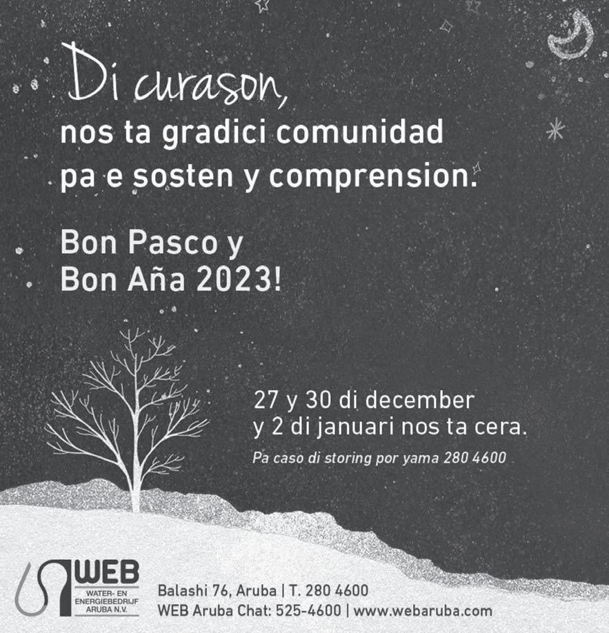 Diabierna 23 December 2022 Minister Ursell Arends riba ciere di Dump Parkietenbos DumP ta bay cera, kico lo cambia P'abo y bo DesPerDicio? Diasabra 24 di december 2022, bispo di Pasco Gobernador di Aruba Su Excelencia Alfonso Boekhoudt lo duna su discurso di Pasco tradicional E programa special aki lo pasa anochi pa 8.00 pm auto a bolter dilanti superfood riba ex sasakiweg canDela Pega cu velD Di riverPlate Diaranzon