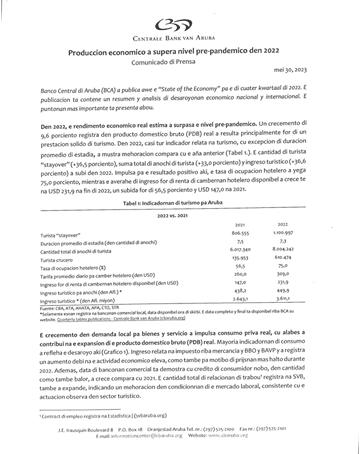 • BCA ta bisa lo siguiente di nos economia: “Den 2022, e rendimiento economico real estima a surpasa e nivel pre-pandemico. Un crecemento di 9.6% registra den producto domestico bruto (PDB) real a resulta principalmente for di un prestacion solido di turismo.