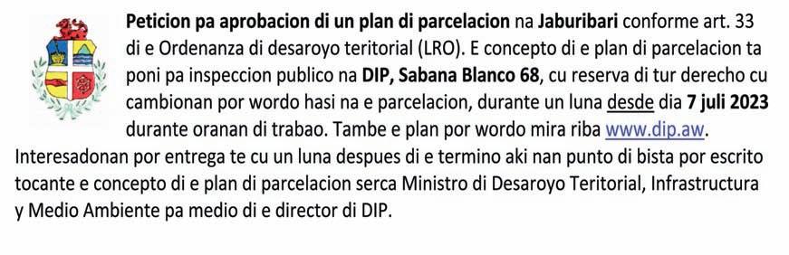 Peticion pa aprobacion di un plan di parcelacion na Barcadera conforme art. 33 di e Ordenanza di desaroyo teritorial (LRO). E concepto di e plan di parcelacion ta poni pa inspeccion publico na DIP, Sabana Blanco 68, cu reserva di tur derecho cu cambionan por wordo hasi na e parcelacion, durante un luna desde dia 7 juli 2023 durante oranan di trabao. Tambe e plan por wordo mira riba www.dip.aw Interesadonan por entrega te cu un luna despues di e termino aki nan punto di bista por escrito tocante e concepto di e plan di parcelacion serca Ministro di Desaroyo Teritorial, Infrastructura y Medio Ambiente pa medio di e director di DIP.