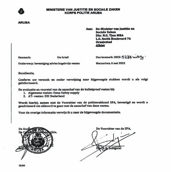 Pa trece claridad na e ponencia aki, e berdad ta cu Ministerio di Husticia y Asuntonan Social a aproba e compra di e vestnan aki, sinembargo, e escogencia a wordo haci door di Alto Mando di Polis y e escogencia di Alto Mando di Polis a wordo aproba pa Sindicato di Polis. Riba e carta adhunto, por wak cu dia 6 di Mei, Sr. Rodney Solognier, kende ta presidente di SPA a firma e carta aki, riba cual e ta aproba e escogencia di Cuerpo Policial.