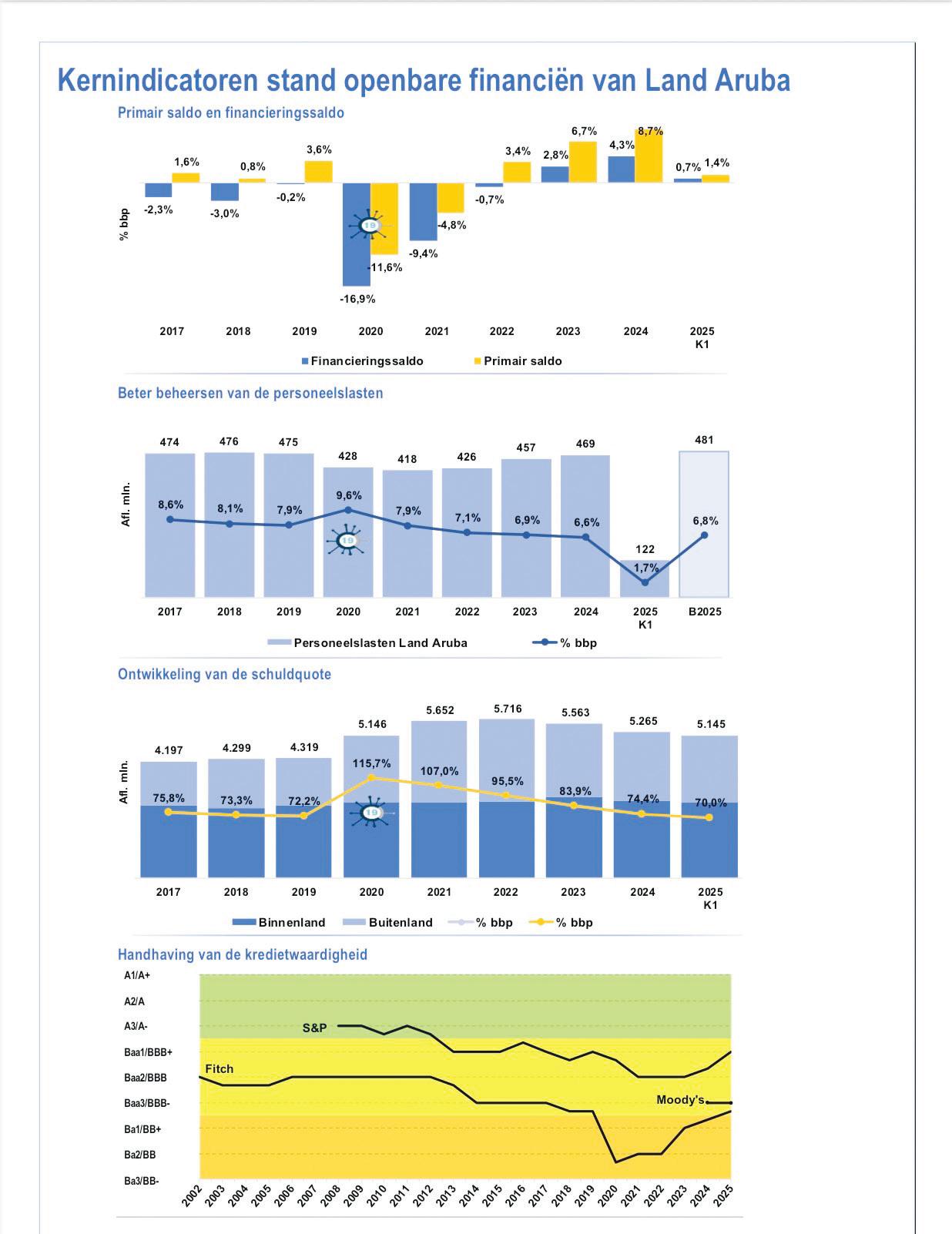 2017 y despues aun mas grandi durante e añanan di e pandemia (20202021), Aruba ta logra bira e pagina. Pa 2023, 2024 y e prome kwartal di 2025, nos ta mira surplus financiero (financieringssaldo positivo) y un saldo primario positivo. Esaki ta crea un buffer financiero importante pa por inverti den infrastructura y duna bek na e pueblo Arubano.
