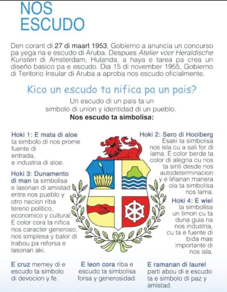 splica e significacion di un detaye inclui den e Escudo di Aruba. Di e manera aki nos tur por haya sa mas di e motibo pakico e Aloë, Hooiberg y Lama, Cruz Blanco, Wiel, Dunamento di Man, Leon y Laurel ta forma parti di e Escudo di Aruba. Por mira nan riba Facebook di UNOCA, Povi-tree y riba Youtube UNOCA Cares Channel.