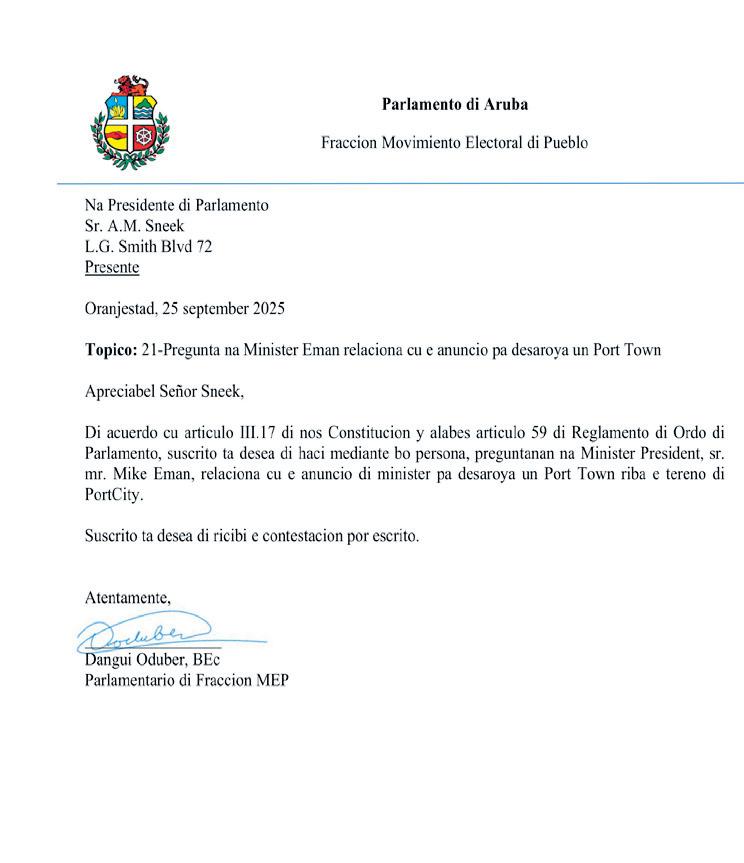 Despues di e anuncio reciente di Prome Minister Mike Eman tocante su vision pa desaroya un “Port Town” riba e tereno di Port City, Parlamentario Dangui Oduber a presenta un serie di preguntanan na Parlamento pa busca claridad riba e plan aki.