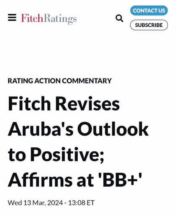 Na februari Fitch Ratings tabata na Aruba pa asina por haci un evaluacion economico y financiero di nos Pais. Nan a reuni cu varios persona y instancia pa asina por formula nan opinion cu ta keda refleha den e rapport cu a keda publica diaranson 13 di maart 2024 cu ta disponibek via https:// www.fitchratings.com/ research/sovereigns/fitchrevises-aruba-outlookto-positive-affirms-at-