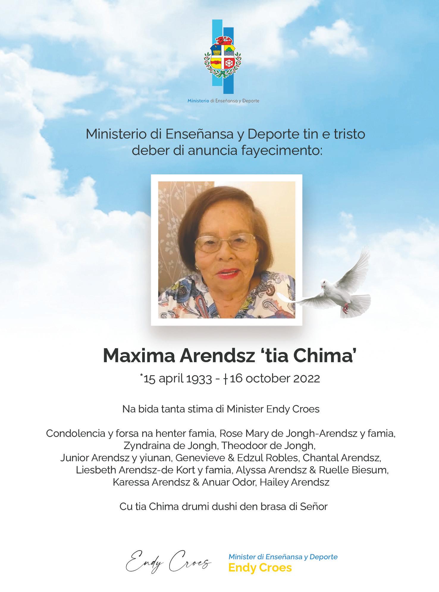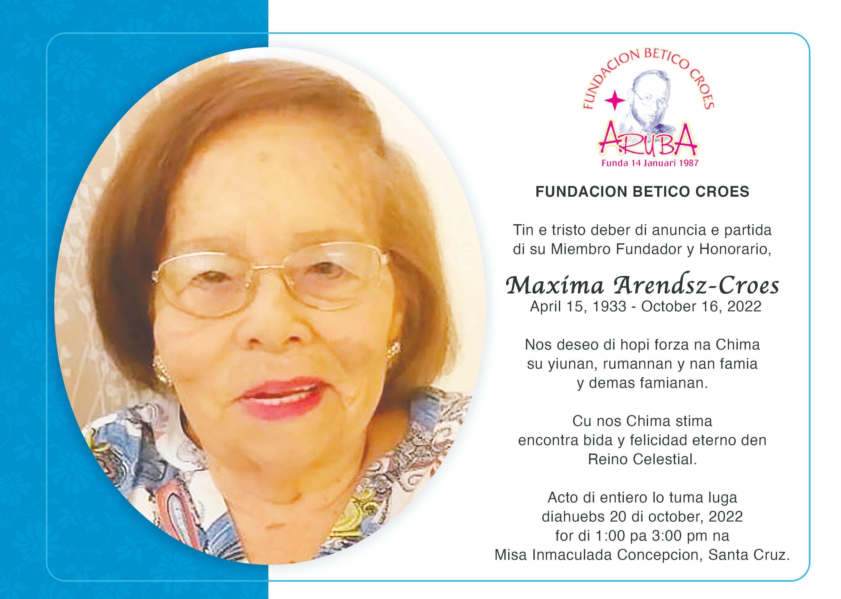 Ta anuncia fayecimento di Sra. Vda. Maxima Arendsz Croes Na bida mama di nos colega Adriaan “Juni” Arendsz