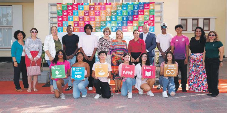 ORANJESTAD – Dia 25 di September ta e dia mundialmente reconoci como SDG Flag Day. Dia cu ta hisa e bandera di e Metanan di Desaroyo Sostenibel, Sustainable Development Goals. Prome Minister Evelyn Wever-Croes riba e mainta aki tawata acompaña pa un grupo di hoben unda cu el a dirigi su mes na nan dunando un splicacion di e importancia di e dia aki y despues di e discurso cortico a bay over na e hisamento di e bandera unda por observa e metanan (SDGs).