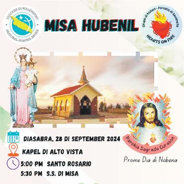 \Pastoral Hubenil Aruba (PHA) ta participa cu e luna aki e misa hubenil ta bay ta na Kapel di Alto Vista y ta toca turno na parokia di Sagrado Curason di Savaneta pa organisa esaki. E misa hubenil aki ta tuma luga diasabra, 28 di september venidero. Ta cuminsa resa santo rosario 5:00 pm y depues ta sigui e santa misa pa 5:30 pm. Ta bay ta presente hobennan di Pastoral Hubenil Savaneta, Noord, Dakota, Paradera, Sta Cruz y Brasil.