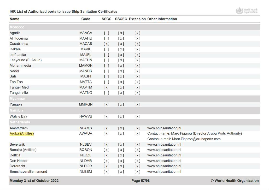 Minister di Turismo y Salud Publico, Sr. Dangui Oduber, ta satisfecho di anuncia cu Aruba a logra subi World Health Organization su lista di ports autorisa pa otorga Ship Sanitation Certificate. Esaki sigur ta un logro remarkabel, mirando cu IHR ta un regulacionan international acorda pa 196 pais na mundo (incluso hulanda y pues Aruba). E acuerdo aki ta consisti di diferente punto, entre otro reenforsa e abilidad di paisnan pa detecta, analysis, raporta, y responde riba eventonan cu por forma un riesgo pa salud publico.