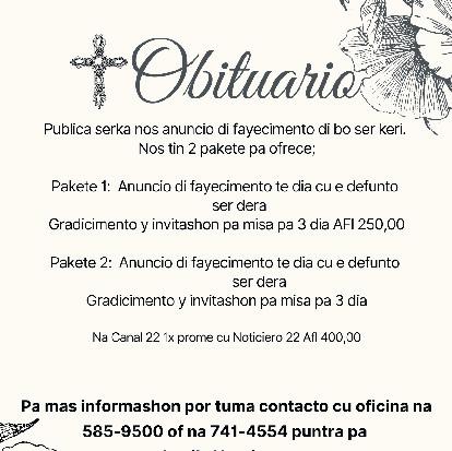 Cu inmenso dolor na nos curason pero conforme cu boluntad di Dios nos ta anuncia fayecimento di nos mama, suegra, wela, bisawela, ruman y tanta stima