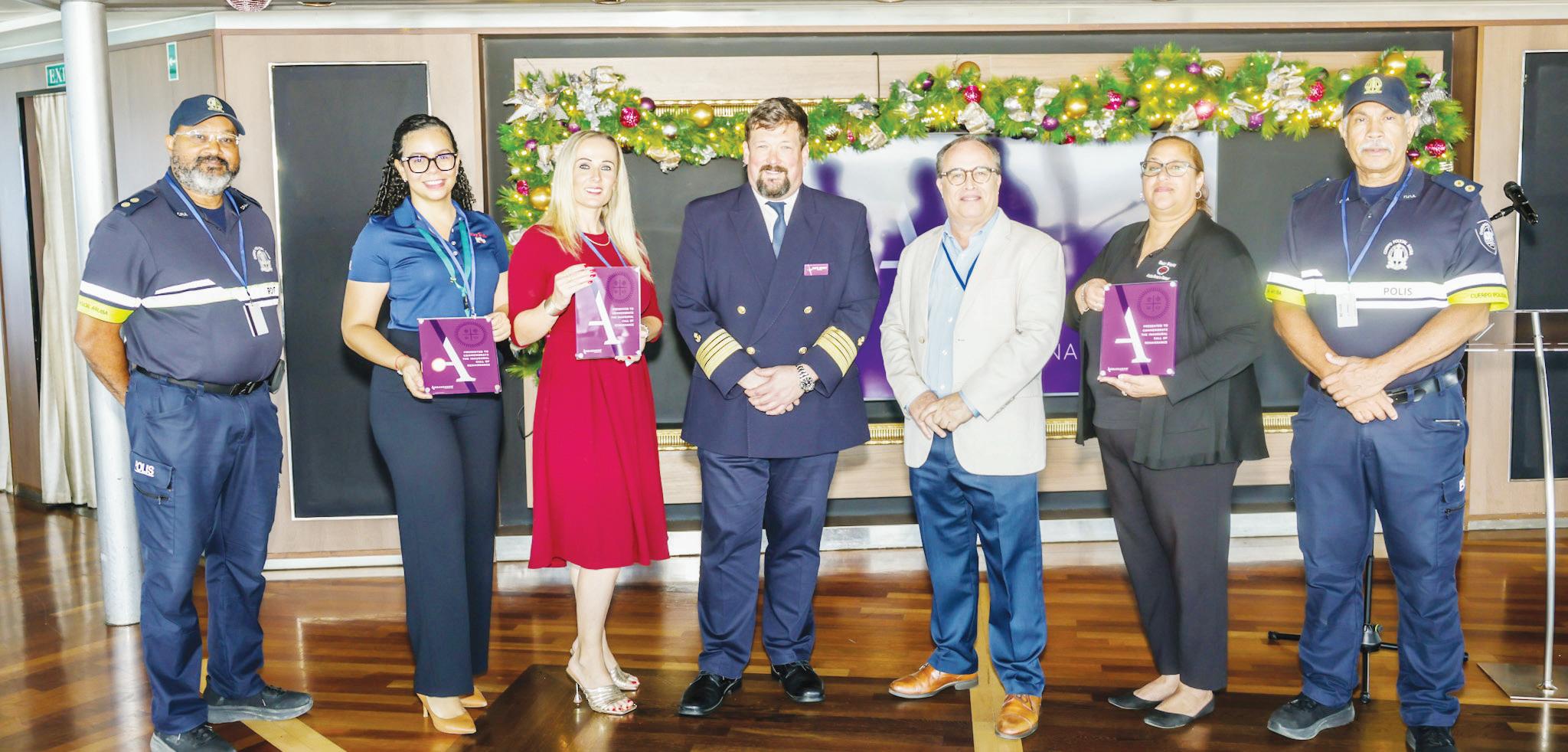 Bos, Cruise Manager, di A.T.A., y Maureen Palm representando agencia di waf Maduro & Sons. Capitan Simon, un lider maritimo cu tin hopi experiencia y cu a bishita Aruba durante decadanan, tambe tabata presente na e ceremonia.