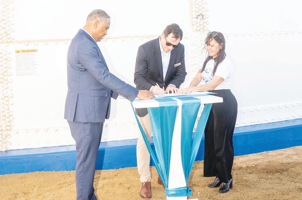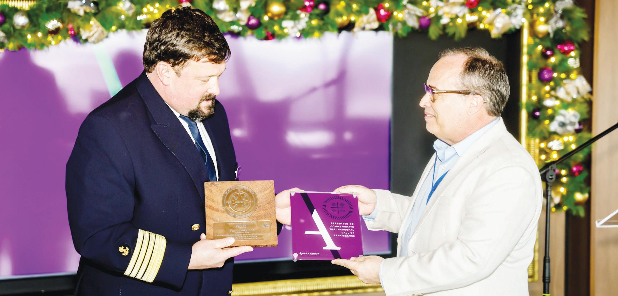 Pa honra e bishita inaugural, un ceremonia di intercambio di plakkaat a tuma lugar abordo di e barco. E tradicion maritimo aki ta simbolisa colaboracion y fortalecemento di laso entre e compania di crucero y e destino. Representando APA NV na e ceremonia tabata Mario Arends, Chief Commercial Officer, conhuntamente cu Monica