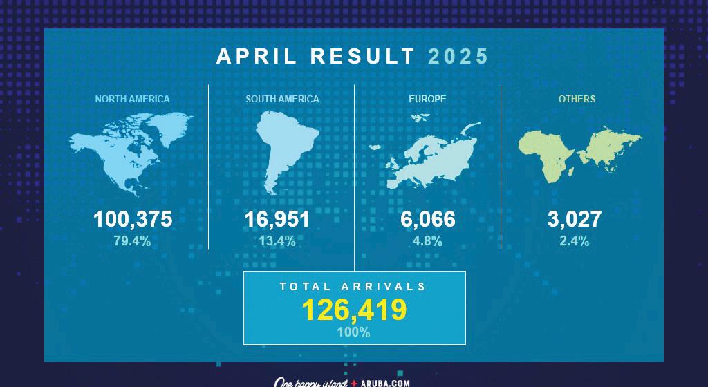 Den april 2025, 79% di e total di e huespednan “stayover” pa Aruba a bishita for di Norte America, 4.8% a bishita for di Europa, 13% a bishita for di Latino America y 2.4% tawata procedente di otro
