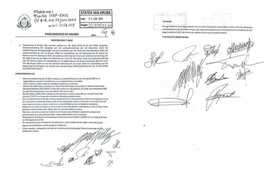 Diahuebs 27 di juni 2024, den sala di Parlamento durante tratamento di e presupuesto supletorio, Parlamentario y miembro di fraccion RAIZ, Raymond Kamperveen, a entrega un mocion cu lo trece alivio pa nos adultonan mayor, na unda nan lo bay bek na por ricibi remedi sin mester