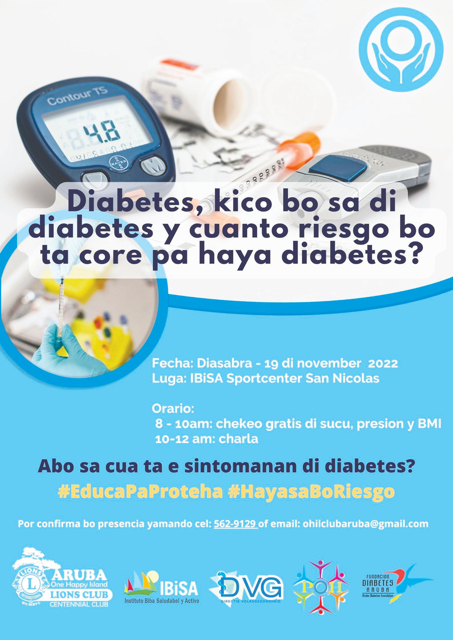 Dia 14 di november proximo ta Dia Mundial di Diabetes y e aña aki Aruba One Happy Island Lions Club a uni hunto cu Fundaccion Diabetico Aruba, IBISA, POH y DVG pa hiba un campaña di control y prevencion di e malesa Diabetes door di informa, educa y conscientisa nos comunidad. E tema di dia Mundial di diabetes 2021-2023 ta “access to diabetes care” y e tema di e di dos aña di e campaña ta “Educa pa proteha mañan”.