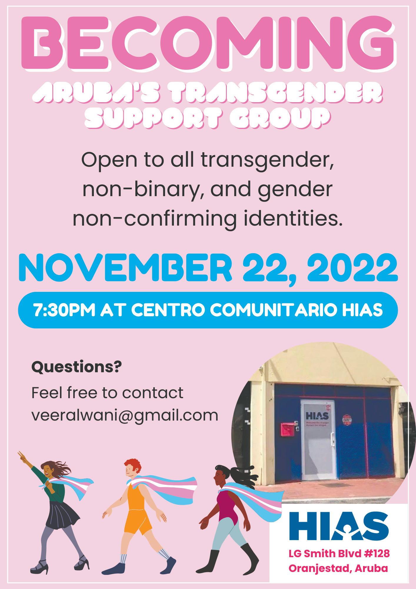 Mirando e necesidad pa un grupo di apoyo pa es nan trans na Aruba, diferente activista a uni pa brinda e espacio necesario aki. E grupo lo wordo facilita door di psi cologo Jermin Bell hunto cu activista trans Sr. Veer Alwani. E plataforma