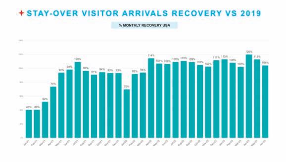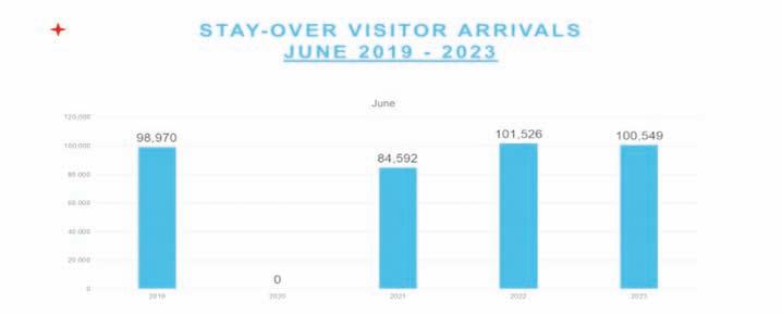 Den luna di juni 2023 nos destinacion a ricibi un total di 100,549 bishitante “stay-over”. Si compara luna di juni 2023 cu juni 2019 - cu tabata e ultimo aña normal di turismo, por mira cu Aruba a recupera 102% di locual a wordo ricibi na juni 2019, cu ta indica un crecemento di 2%. Si compara juni 2023 cu juni 2022 por wak un recuperacion di 99% cu ta indica un disminucion di 1%.