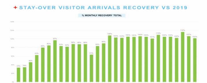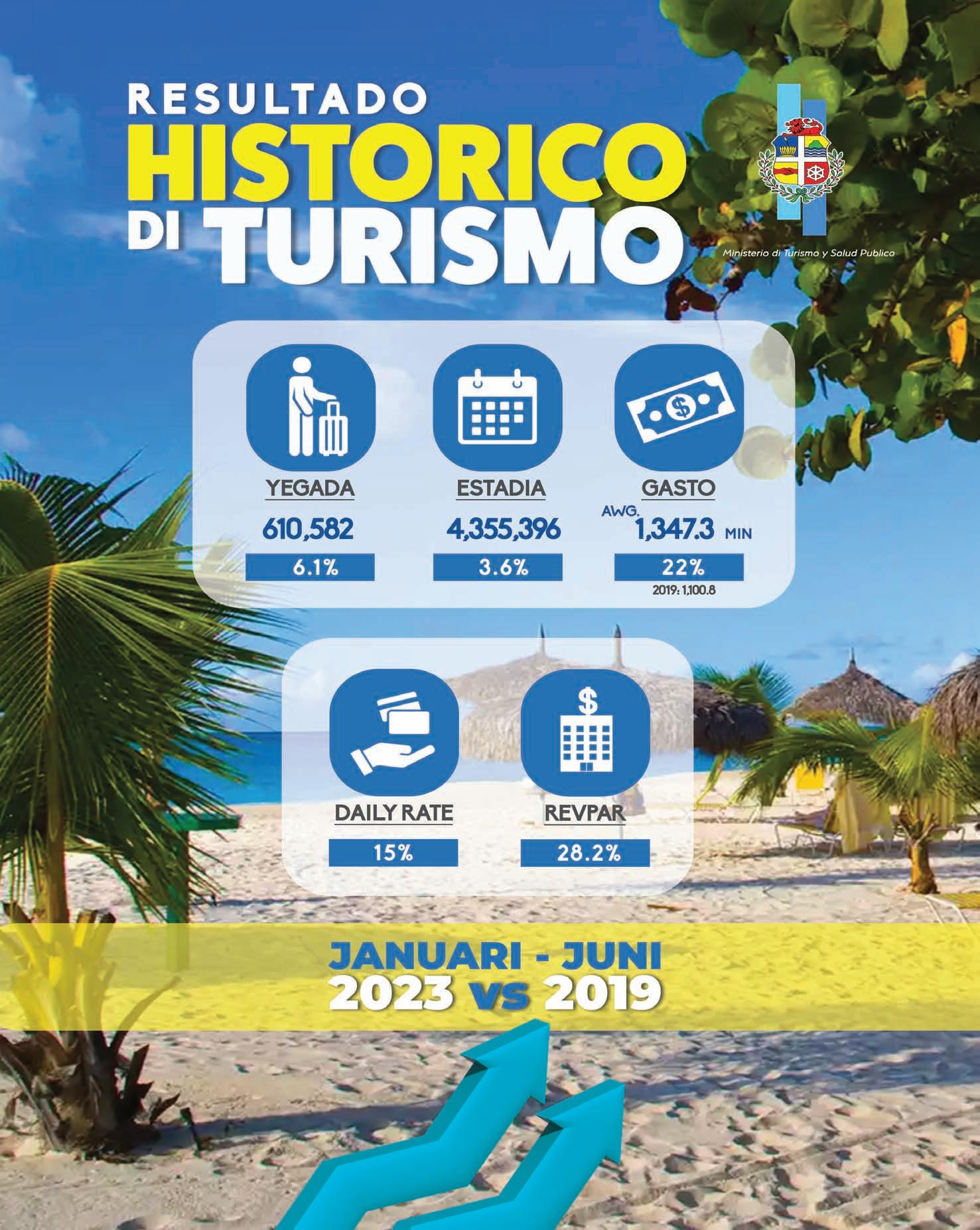 Den e prome mitar aña di 2023, Aruba a ricibi un total di 610,582, bishitante “stayover”, esaki ta un crecemento di 6.0%, compara cu e prome 6 lunanan di 2019, unda a ricibi 575,649 bishitante “stayover”. Si compara e prome 6 lunanan di 2023 cu e prome 6 lunanan di 2022, por wak un crecemento di 16%, bayendo for di 528,325 bishitante “stayover”pa 610,582 bishitante “stayover”. Aruba ta sigui como un di e top destinacionnan cu a recupera