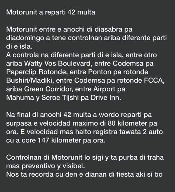 Motorunit entre e anochi di diasabra pa diadomingo a tene controlnan ariba diferente parti di e isla. A controla na diferente parti di e isla, entre otro ariba Watty Vos Boulevard, entre Codemsa pa Paperclip Rotonde, entre Ponton pa rotonde Bushiri/ Madiki, entre Codemsa pa rotonde FCCA, ariba Green Corridor, entre Airport pa Mahuma y Seroe Tijshi pa Drive Inn.