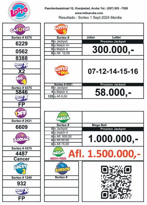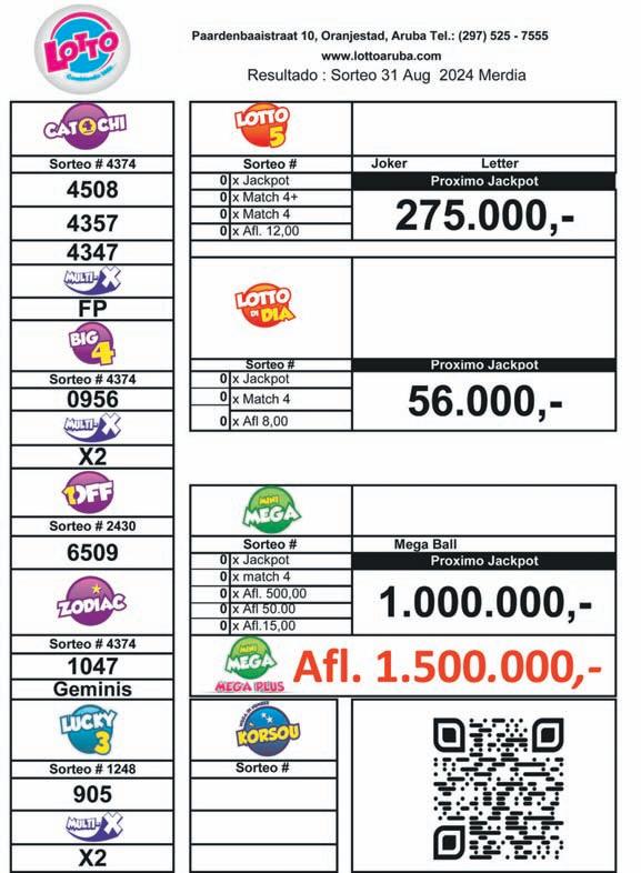carga deporte y duna oportunidadnan na e generacion nobo di atletanan. E decision di 2011 lo wordo recorda como un les duru pero crucial den historia di Aruba. Afortunadamente, cu e trabao actual, Aruba a demostra cu ta posibel pa corigi e errornan di pasado y move pa un futuro mas prospero y husto pa tur hende. E regreso di Lotto den man arubiano no solamente ta un acto di orguyo nacional, sino tambe un testimonio di kico ta posibel ora cu e interesnan di e pueblo ta wordo prioritisa. Pabien Minister Endy Croes, pabien Promer Minister Evelyn Wever Croes, pabien Aruba. Aruba a gana.