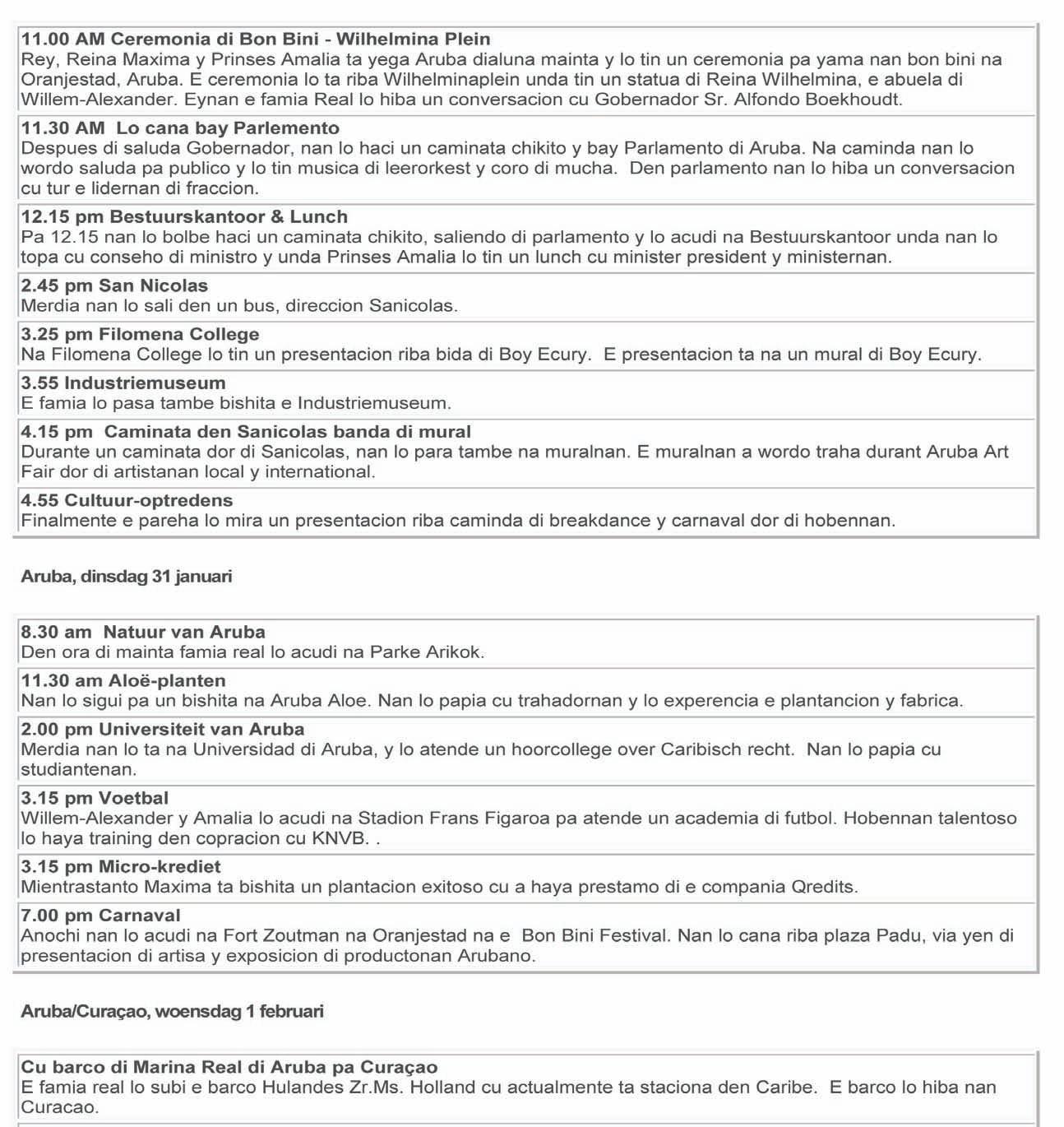 Prome Minister a sigui splica cu diamars dia 31 di januari, lo bay tin algun actividad mas chikito, unda cu pueblo un bes mas ta bon bini. Den oranan di mainta Prinses Amalia ta bishita Aruba Aloe Balm y despues e famia Real nan lo bishita Universidad di Aruba caminda lo tin un debate cu hobennan y combersacionnan riba diferente tema. Despues Rey Willem Alexander y Pinses Amalia lo bay Frans Figaroa, como cu Reina Maxima tin otro sitio pa atende. Diamars atardi, dia 31 lo bay tin un tremendo Bon Bini Festival y diferente actividad riba Plaza Padu dedica na e Famia Real cu ta di bishita. E anochi lo termina den Fort Zoutman pa nan experiencia e Bon Bini Festival cu nos ta custuma di dje. Asina lo percura pa Rey Willem Alexander, Reina Maxima, y Prinses Amalia experiencia Aruba y yega cerca di pueblo manera cu nan deseo ta. Diaranson mainta no lo tin tempo pa ningun actividad,