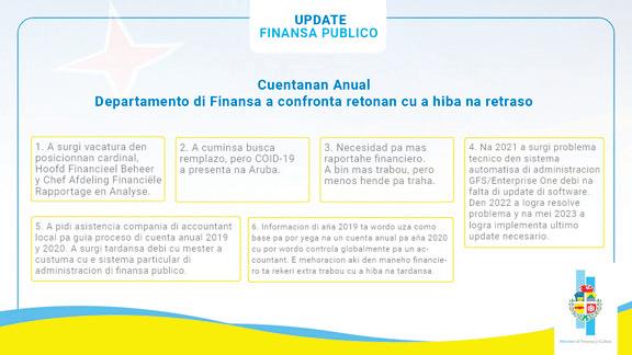 Problema tecnico den sistema automatisa Na aña 2021 a surgi un problema tecnico den e sistema automatisa di administracion GFS/Enterprise One cu ta wordo uza pa Departamento di Finansa, debi na falta di update di e software. A traha pa soluciona esaki y aunke den aña 2022 a logra resolve e problema, ta te na mei 2023 a logra implementa e ultimo update necesario. E fayo tecnico aki tambe a cau-