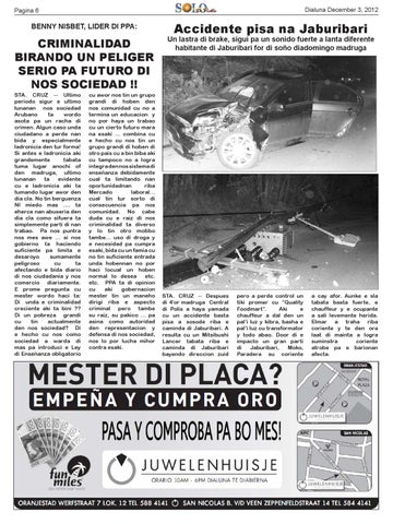 CRIMINALIDAD BIRANDO UN PELIGER SERIO PA FUTURO DI NOS SOCIEDAD !! STA. CRUZ -- Ultimo periodo sigur e ultimo lunanan nos sociedad Arubano ta wordo asota pa un racha di crimen. Algun caso unda ciudadano a perde nan bida y especialmente ladronicia den tur forma! Si antes e ladronicia aki grandemente tabata tuma lugar anochi of den madruga, ultimo lunanan ta evidente cu e ladronicia aki ta tumando lugar awor den dia cla. No tin berguenza NI miedo mas …. ta eherce nan abuseria den dia cla como sifuera ta simplemente parti di nan trabao. Pa nos puntra nos mes awe … si nos gobierno ta haciendo suficiente pa limita e desaroyo sumamente peligroso cu ta afectando e bida diario di nos ciudadania y nos comercio diariamente. E prome pregunta cu mester wordo haci ta: Di unda e criminalidad creciente aki ta bini ?? Di un pobreza grandi cu tin actualmente den nos sociedad? Di e hecho cu nos como sociedad a warda di mas pa introduci e Ley di Enseñanza obligatorio