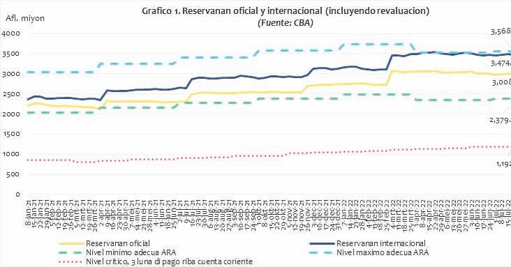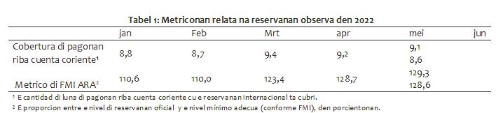 Reservanan internacional y oficial E reservanan internacional, cu ta consisti di reservanan oficial di BCA y reservanan di divisa na e banconan comercial a subi cu Afl. 345,2 miyon (Grafico 1) riba 29 di juli 2022, compara cu fin di december 2021. E reservanan oficial a aumenta cu Afl. 264,0 miyon durante e mesun periodo, mientras cu e reservanan teni pa banconan comercial a subi cu Afl. 81,2 miyon. Consecuentemente, riba 29 di juli 2022, e reservanan oficial y internacional a suma Afl. 3.008,9 miyon y Afl. 3.474,8 miyon, respectivamente. Pa e resto di 2022, BCA ta premira mas expansion den e reservanan internacional y oficial debi na extra entrada di divisa relata na turismo y un subida den inversion procedente di exterior. Mantencion di un nivel adecua di reservanan ta critico pa mantene e tasa di cambio fiho entre e florin Arubano y e dollar Mericano. Relata na esaki, BCA ta anticipa cu reservanan internacional lo permanece riba e tres luna di pago riba e cuenta coriente di e balansa di pago. E pagonan riba e cuenta coriente di balansa di pago ta consisti di pagonan pa importacion, pago di interes na inversionistanan stranhero y transferencianan pa exterior manera placa manda afo door di trahadornan stranhero. Ta proyecta cu e reservanan oficial lo permanece dentro di e margen aceptabel basa riba e metrico ‘Assesing Reserve Adequacy’ (ARA) di e Fondo Monetario Internacional (FMI) (Tabel 1).