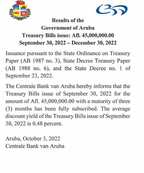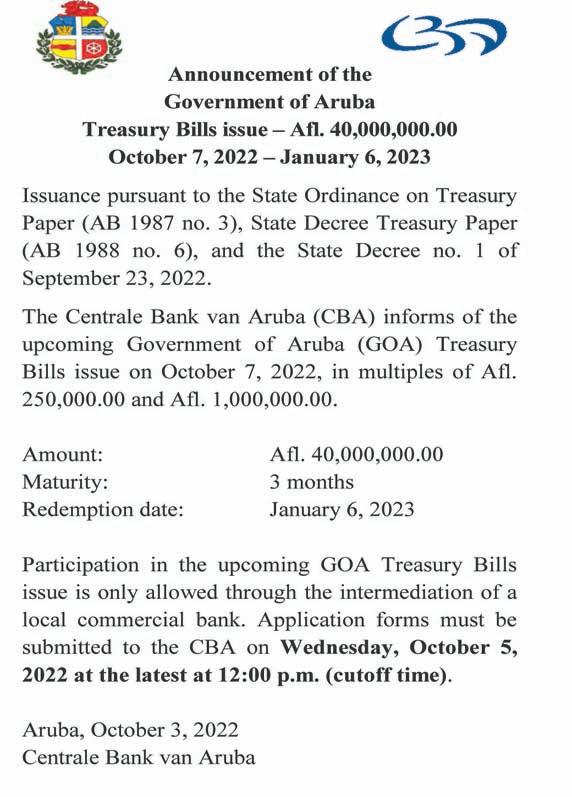 Conforme e tarea di e Comite di Maneho Monetario (CMM) pa evalua, dicidi y duna transparencia riba e accionnan di maneho monetario di Banco Central di Aruba (BCA), BCA ta desea di comunica lo siguiente. Durante e reunion di 17 di augustus 2022, CMM a dicidi pa mantene e reserva obligatorio na 24,0 porciento entrante 1 di september 2022. Di e manera aki, e banconan comercial mester tene un balansa minimal na BCA cu ta igual na 24,0 porciento di e depositonan riba termino cortico di nan clientenan. E decision pa mantene e reserva obligatorio na 24 porciento ta basa primordialmente riba e bahada continuo den e nivel di likides excesivo na e banconan comercial, ademas di un nivel adecua di reservanan oficial y internacional.