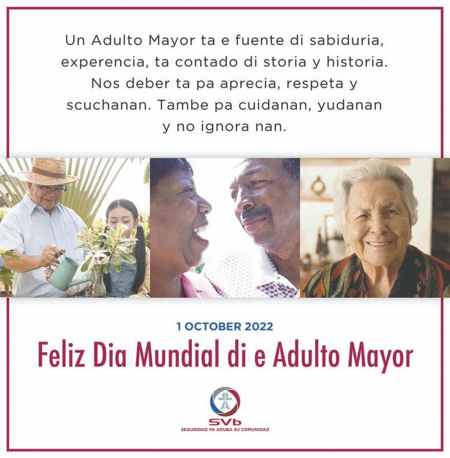 Dia 14 di december 1990 Asamblea General di Nacionnan Uni a designa 1 di october como Dia Internacional di Adultonan Mayor. E gobierno aki a bin ta reconoce cu ta su tarea pa garantisa cu nos adultonan mayor mester tin e calidad di bida halto cu nan merece. Den nan hubentud nan a contribui na biennestar di Aruba y awor ta nos turno pa
