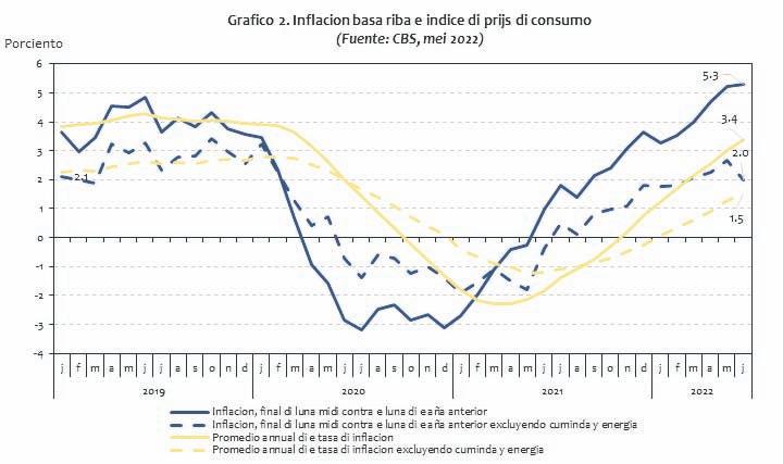Na juni 2022, e Indice di Prijs di Consumo (IPC) tabata 5,3 porciento mas halto compara cu e mesun luna di e aña anterior (Grafico 2). E aumento aki den e IPC compara cu e
