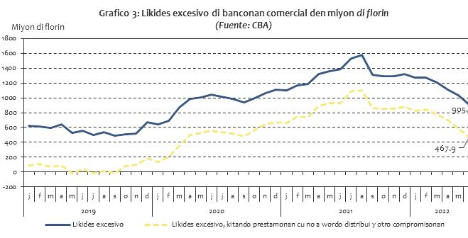 Likides excesivo na banconan comercial E total di likides excesivo na e banconan comercial a baha di Afl. 1.307,7 miyon na december 2021 te na Afl. 905,7 miyon na juni 2022 (Grafico 3). E caida significante aki den likides excesivo ta debi principalmente na e subidanan consecutivo den e tasa di reserva obligatorio durante e prome seis lunanan di 2022. No obstante, e nivel di likides excesivo a keda significantemente mas halto cu e nivelnan midi prome cu e pandemia (+ Afl. 266,3 miyon). Esaki tabata a causa di e nivel eleva di fondonan di likides (cu ta inclui cash, bononan di gobierno y otro activo likido) na banconan comercial, empuha tambe door di e nivel abou di demanda pa credito. Sinembargo, financiamento local di proyectonan relata na turismo y di negoshinan probablemente lo crece den e di dos mita di 2022, resultando den un bahada di e nivel di likides excesivo na e banconan comercial.