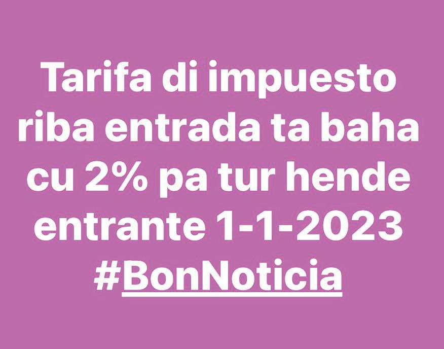 di nos pensionadonan. Entre otro lo baha tarifa di inkomstenbelasting y loonbelasting, hisa e suma cu ta liber di impuesto, aumenta reparatie toeslag pa pensionadonan, den caso cu ta pensionadonan cu ta pareha casa, awo e pension ta wordo conta hunto cerca esun cu tin entrada mas halto. E cambionan aki ta drenta na vigor entrante januari 2023 y lo causa un alivio financiero sumamente grandi pa nos pensionadonan.
