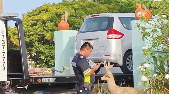 Diabierna atardi despues di e accidente na Macuarima e chauffeur cu a agredi e dama despues di e accidente a bandona e sitio y a bay sconde e auto patras di su cas, Polis a nota cu e auto ta scondi patras y a pita pa e chauffeur sali pero e no kier a sali. Un persona di edad a sali pafo y polis a bis'e cu si e chauffeur no sali e ta confisca e auto unda e tin'e scondi. Como cu no por a haci otro na final polis a laga takelwagen saca e auto y bay cu e auto warda di polis na Santa Cruz pa asina esun responsabel tras stuur para pa su actonan.