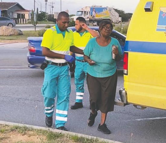 Na yegada di e ambulans nan a atende e dama levemente herida na e sitio mes. Como cu e dama tabata sinti poco dolor y mirando su edad polis a considera y a hiba e dama pa su cas cual no ta biba mucho leu di eynan.