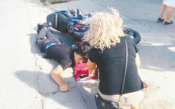 a pidi pa polis di trafico y ambulans. Locual a sosode ta cu un auto a bira dilanti di e brommer y e motociclista a bay dal riba dje y ela resulta herida y hasta cu su man a kibra.