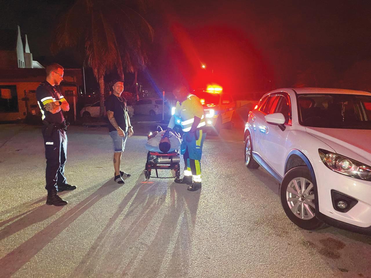 Diasabra anochi a drenta informe di un accidente cu hende herida dilanti Tai Sheng Hardware, mesora a dirigi tanto polis como ambulans na e sitio. Na yegada di e patruya a bin compronde for di e casa di e homber cu nan tabata na un evento familiar y e homber a consumi basta alcohol y den e auto e homber a start un discucion unda ela bisa cu e ta bay bula for di e auto den coremento aki e casa a gara su flanel wanta y a baha velocidad. E homber a habri porta y a bula sali