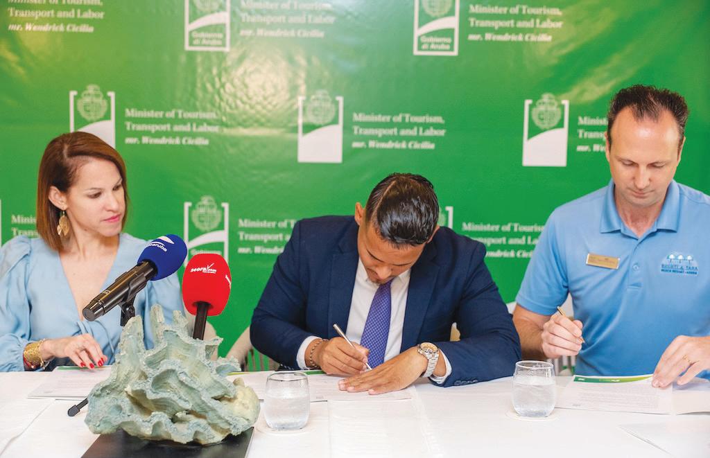 E ceremonia di firmamento a trece e partnernan clave hunto, entre otro Ronella Croes CEO di Aruba Tourism Authority, Crescenzia Biemans como Secretaria di Stimami Sterilisami y Rik van der Berg di Bucuti & Tara Beach Resort. Hunto, e organisacionnan aki ta forma un coalicion fuerte dedica na mehora e bienestar di bestia, proteha medio ambiente di Aruba y engrandece e imagen turistico di nos isla.