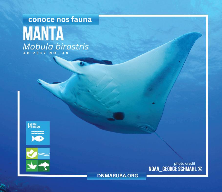 ORANJESTAD – Directie Natuur en Milieu DNM) ta informa tocante e especie protegi Manta. E manta yama na Ingles Giant Manta Ray (Mobufa birostris) ta haya su nomber gigante como cu e ta esun di mas grandi di e mantanan di mundo. E por midi te cu 8 meter cu su halanan habri y por pisa rond di 2000 kilo. E embranan ta poco mas grandi cu e machonan. E manta aki por biaha te na un maximo velocidad di 40 kilometer pa ora. E manta gigantesco aki ta animalnan migrante cu ta crece poco poco. E manta su repoduccion ta sosode cada 2 pa 3 aña y e ta haya un yiu