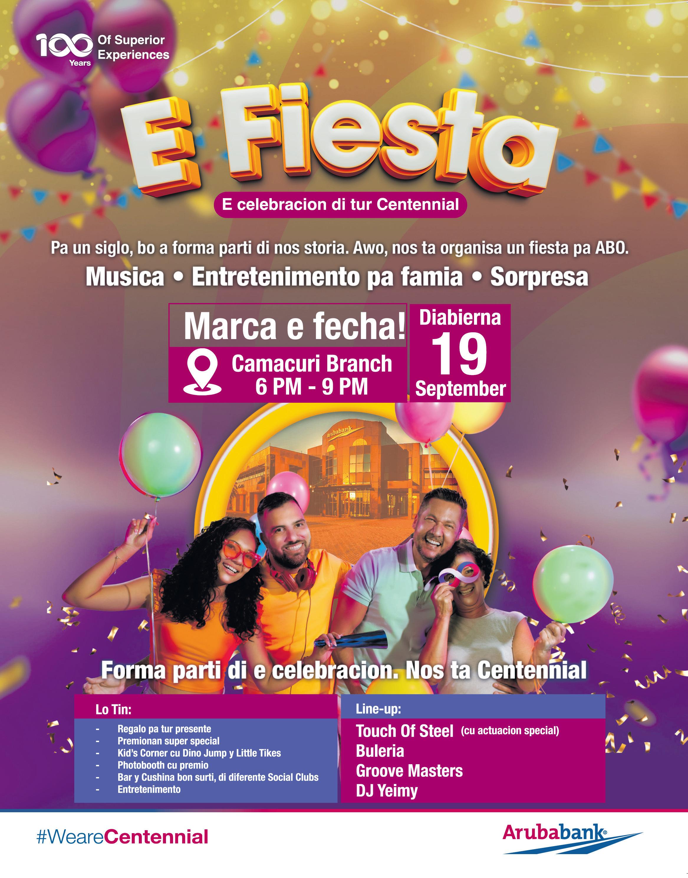 Oranjestad, Aruba – 08 di september 2025 – Aruba Bank orguyosamente ta anuncia E Fiesta, e celebracion na honor di nan 100 aña di exito y progreso.