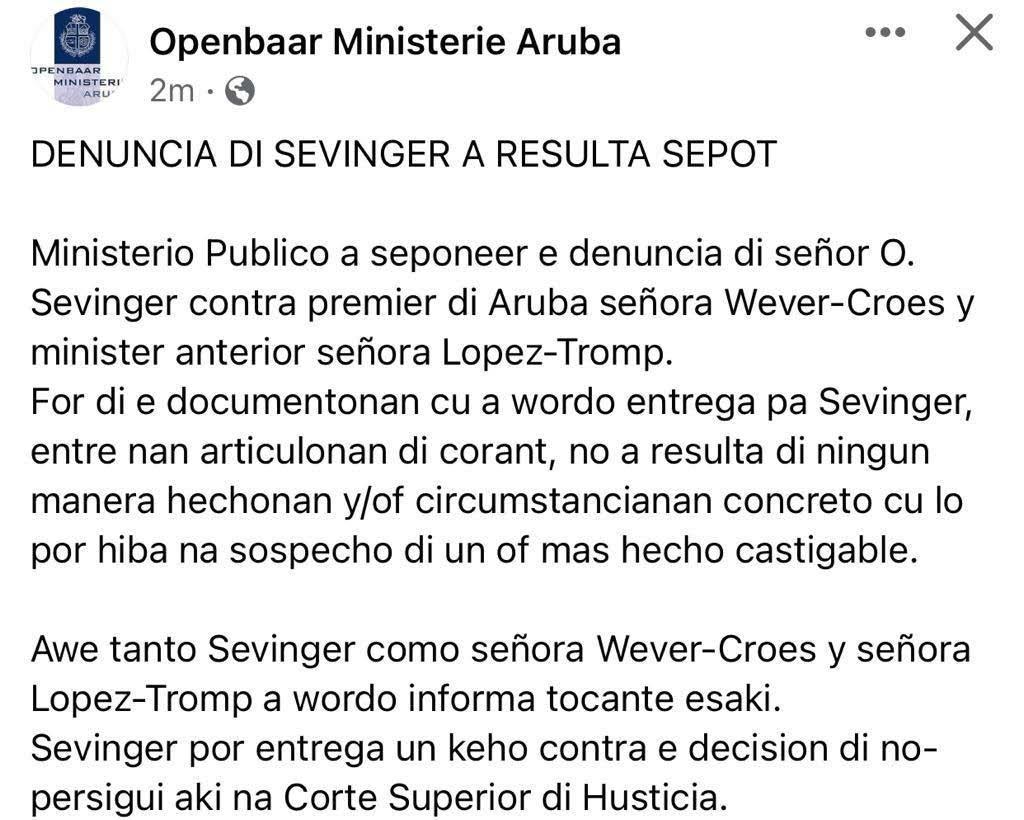 Despues cu nos por a wak cu e fechanan di caso Avestruz tabata yegando na september, Benito Sevinger a cuminsa dal saltonan di desesperacion y a cuminsa acusa Minister President di Aruba di corupcion cu terenonan. Increibel pero berdad, e politico acusa den e caso di corupcion di mas grandi den historia di pais Aruba, ta inventa un storia pa trata na atacha e bon nomber di nos Minister President. Un intento baho pa desvia atencion di su caso den Corte cu ta bay continua cada luna te cu februari, e luna den cual Corte ta spera di dicta sentencia final den e caso di Avestruz. Mi por imagina cu Benny mester a haya un golpi fuerte diaranson atardi ora Ministerio Publico a saca un comunicado den cual Ministerio Publico ta seponeer Benny su denuncia contra Minister President y Marisol LopezTromp. Asina e esfuersonan di desesperacion y panico di Benny a cay na awa, y awor no ta ked’e nada otro mas, cu pa landa su so den su propio lama di corupcion.