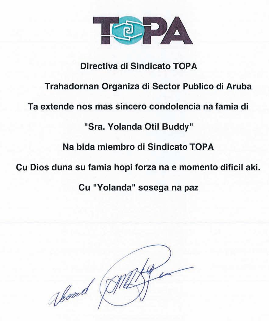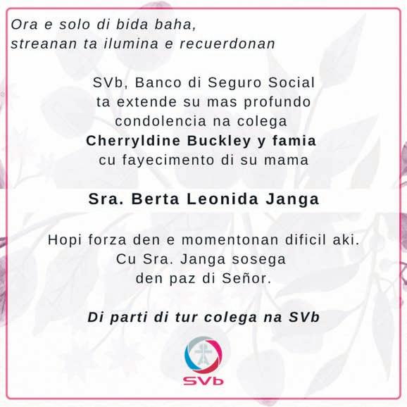 Señora Laura d.f.m a nace 18 di februari 1911 y a fayece 8 di september 1962. Pa recorda señora Laura su 62 aña di fayecimento, nos ta invita e famia grandi di CLWP, sra. Laura su famianan, su conocirnan y tur otro cu ta aprecia tur loke e a haci den su bida, pa asisti diadomingo awor 8 di september na un Santo di Sacrificio di misa na Inmaculada Concepcion na Santa Cruz pa 6.30 di atardi. Alabez pa pidi nos Señor bendicion pa e aña escolar 2024-2025, pa gradici pa tur e bendicionnan ricibi y pa e bunita reconocimentonan cu sra. Laura ainda ta sigiu recibi despues di su partida di e mundo terenal aki.
