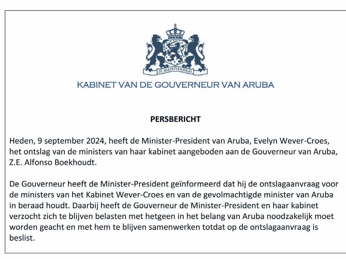 Prome Minister Evelyn Wever-Croes a entrega retiro di Gabinete WeverCroes II. Di awor en adelante Aruba lo tin un Gobierno demisionario y esaki por atende solamente cu asuntonan coriente te ora un Gobierno nobo wordo forma.